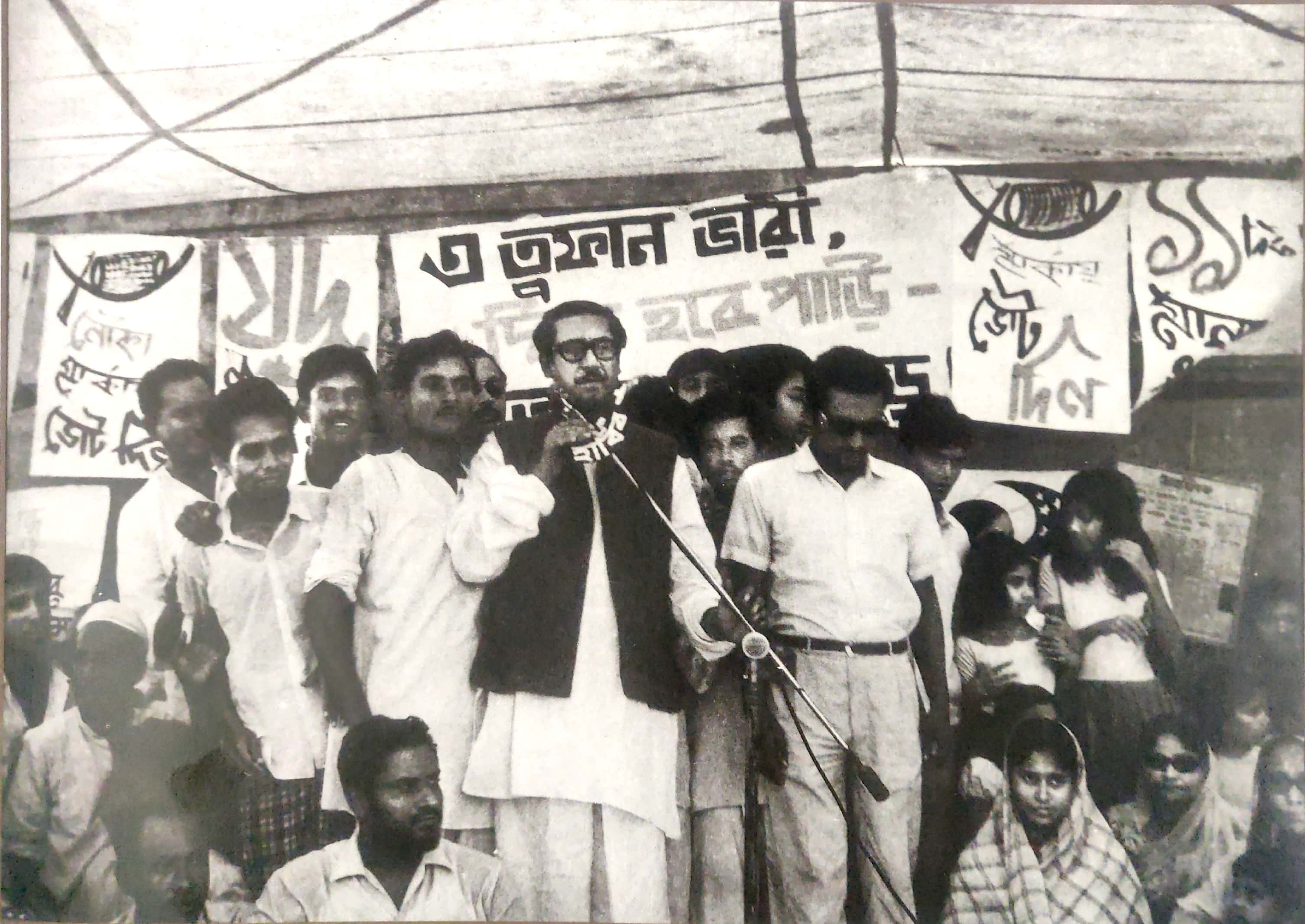 তরুণ ছাত্রনেতা শেখ মুজিবুর রহমান (পিছনে দাঁড়িয়ে) এবং কোলকাতায় মহাত্মা গান্ধীর সঙ্গে হোসেন শহীদ সোহরাওয়ার্দী। হিন্দু-মুসলিম সাম্প্রদায়িক দাঙ্গার (1947) বিরুদ্ধে মহাত্মা গান্ধীর প্রতিবাদকে সমর্থন করার জন্য তারা সেখানে ছিল।