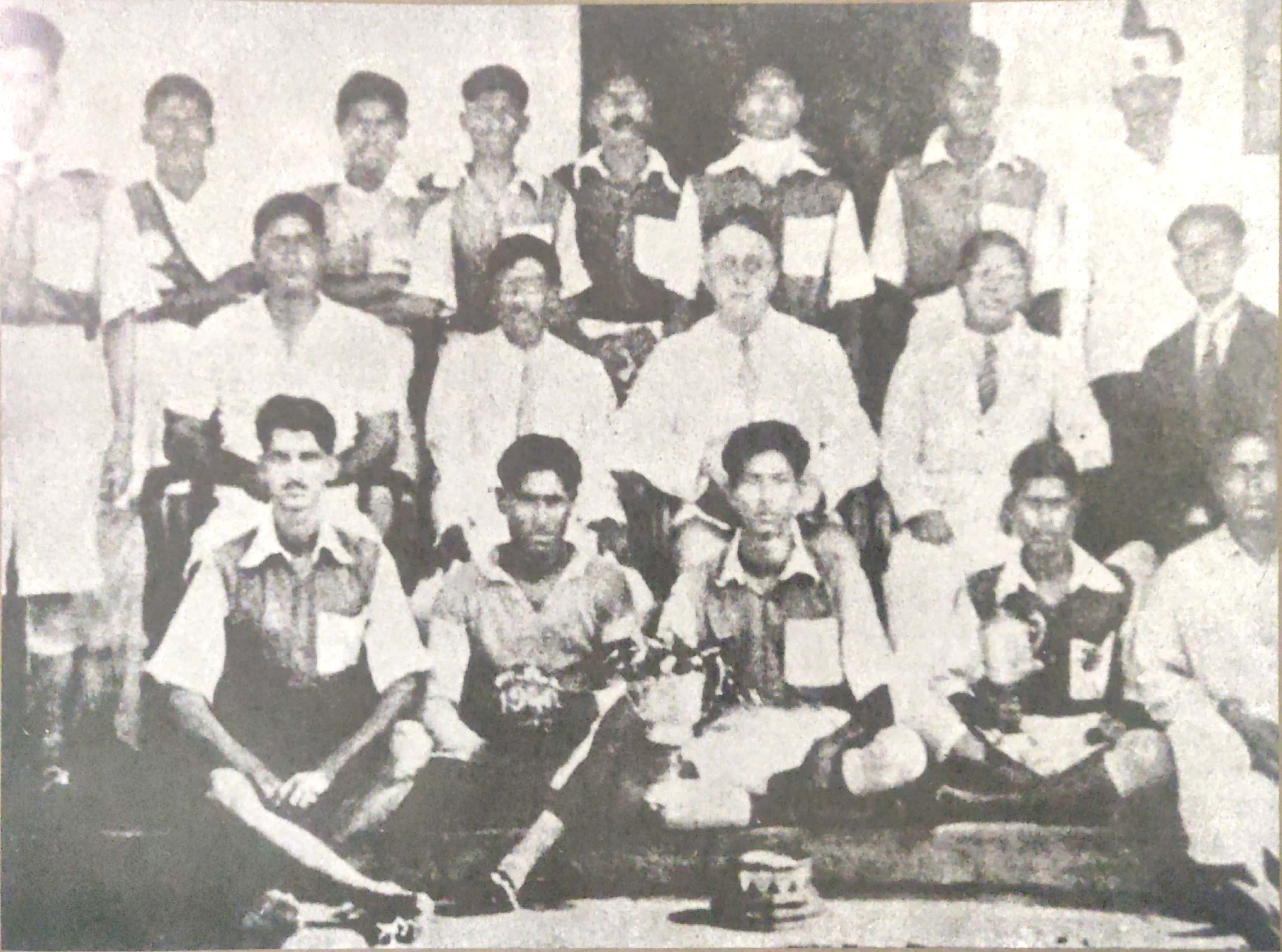 তরুণ ছাত্রনেতা শেখ মুজিবুর রহমান (পিছনে দাঁড়িয়ে) এবং কোলকাতায় মহাত্মা গান্ধীর সঙ্গে হোসেন শহীদ সোহরাওয়ার্দী। হিন্দু-মুসলিম সাম্প্রদায়িক দাঙ্গার (1947) বিরুদ্ধে মহাত্মা গান্ধীর প্রতিবাদকে সমর্থন করার জন্য তারা সেখানে ছিল।